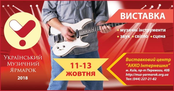11 - 13 жовтня в Експоцентрі "АККО Інтернешнл" (м. Київ, пр. Перемоги, 40,б) відбудеться одна з наймасштабніших музичних виставок Східної Європи - Український музичний ярмарок-2018, де можна буде знайти повний асортимент усієї продукції та сучасних технологій необхідних для створення та просування музики, розвитку сценічного мистецтва.