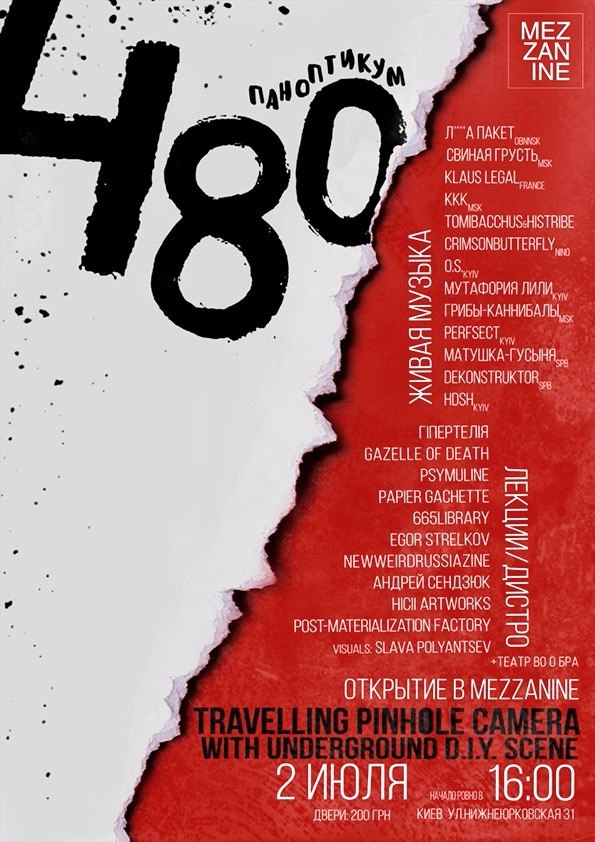 Третье отделение передвижной экспозиции «480КМ» - повествующей о погребенной в брянских лесах «неизвестной сцене» СНГ - откроют видные деятели отечественной и зарубежной самиздат-культуры: обнинские Л****а Пакет, Crimson Butterfly (Нижний Новгород), Свиная Грусть (Москва), а также свето-шумовой проект из Франции Klaus Legal и многие другие. Среди украинских участников киевляне Malad.
